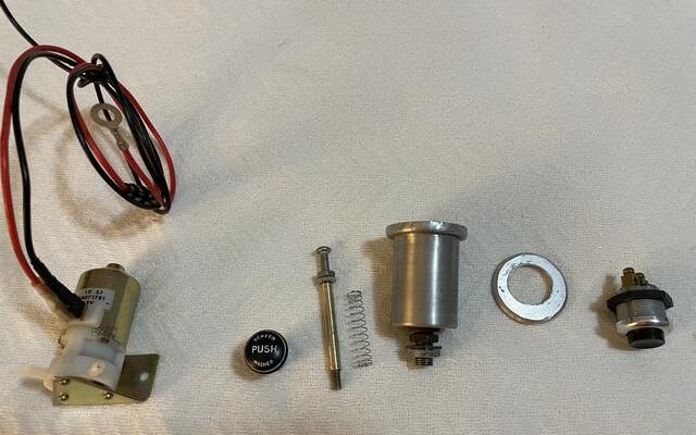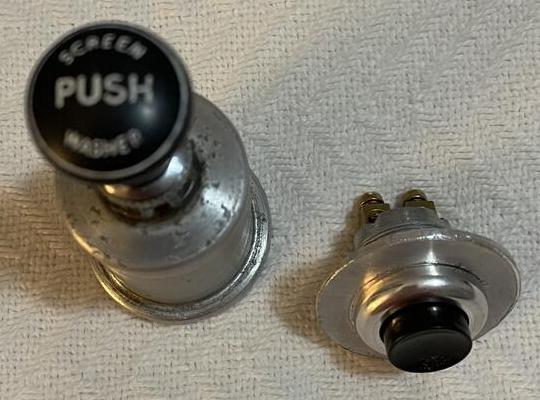 "My 57 MGA Coupe came from the factory with the optional windscreen washer. I restored the manual pump cosmetically but have never been able to get the manual pump to work. I thought about what I could do and came up with this. --- I’m going to install an electric MGB windscreen washer pump in my MGA that will be activated by the original pump knob so the dash will look as original. I removed the rubber bulb from the original pump housing and I am using the original stem/knob to push a starter button I bought from Holden Vintage & Classic that I installed in the back of the original pump housing. I had to fabricate a 1” diameter washer with a hole large enough to accept the switch.