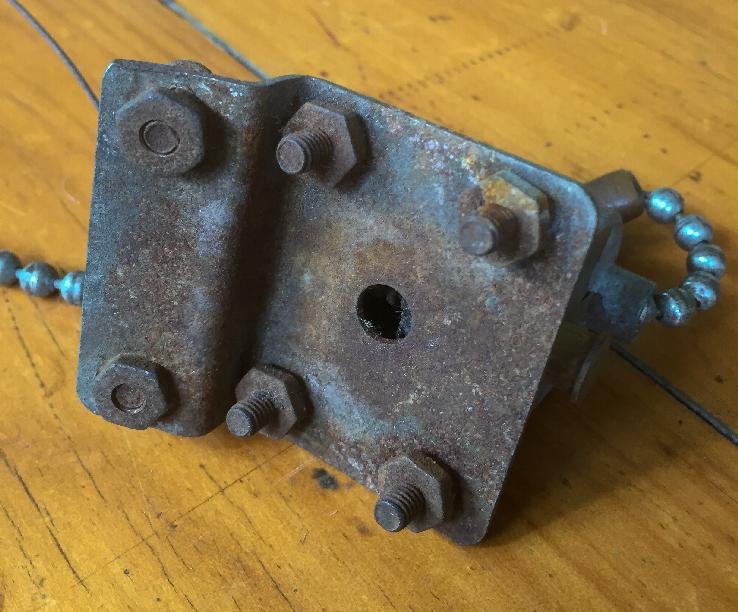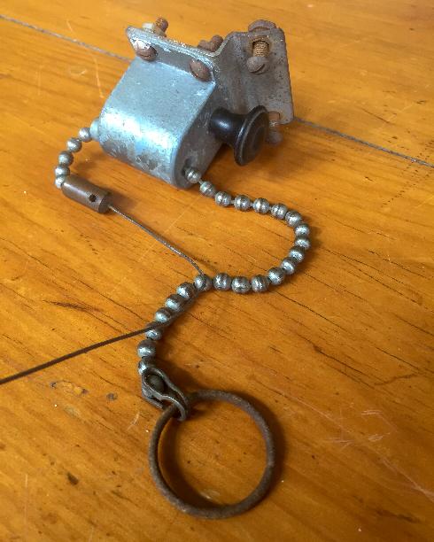 Photos below show the bead chain and the control fitting that is to be mounted on the edge of the dash panel (possibly missing a right angle bracket). It is a one-handed control, operated by pulling the key-ring attached to the chain. To release the blind, the Bakelite knob is pulled and the chain retracts (maybe with a sudden slap). A rather quaint 1950's style analog/mechanical solution to a simple problem.