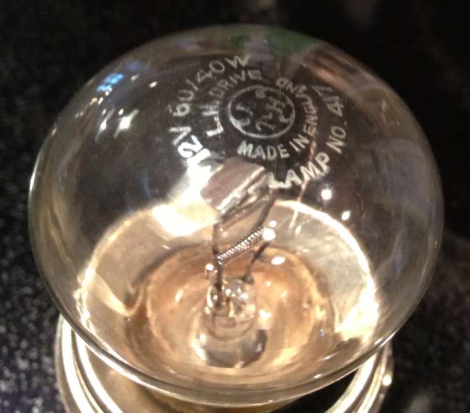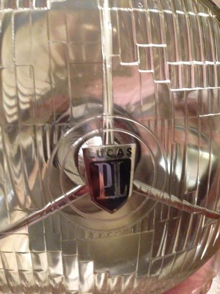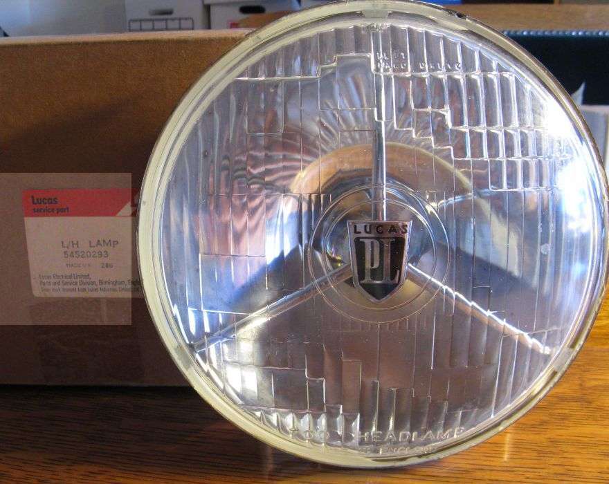 Fair warning here. This is not the best picture for this part, as it is actually a rather poor reproduction of a Lucas PL700 headlamp. The reproductions are hard to tell from the originals at first glance. There are some minor variations in the lettering in the Lucas logo, the back of the bulb may not be painted the right color, the outer mounting flange may be thicker, and the ribbing in the glass lense may not be as crisp as the original parts. But the greater problem by far is poor optical quality. The repro lamps may blind oncoming drivers and scatter a lot of light into the trees and on the roadbanks.