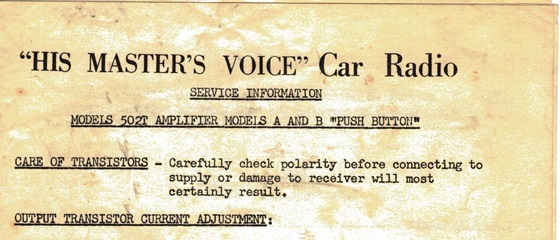 "His Masters Voice" Car Radio SERVICE INFORMATION