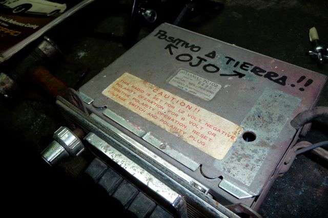 Original accessory radio by Sylvania. According to the tag it was originally configured for 12 volt negative earth. According to the hand writing (in Spanish), it was reconfigured for positive earth for use in the MGA.