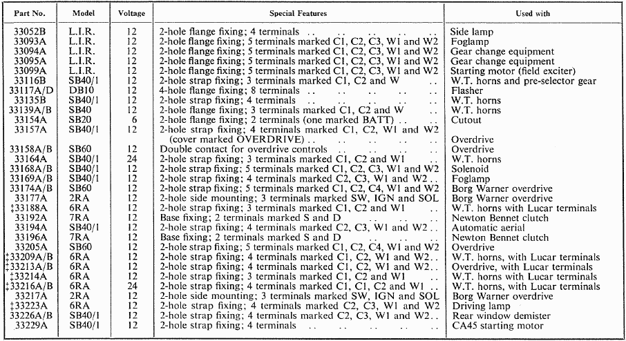 "A result of rewiring and sorting out a friend's car and trying to get the flash to pass system working again after the original relay fell apart. The relay has to be one with C1/C2/W1/W2 markings. The image below is taken from the Lucas manual and correctly lists the configuration of each of the relay types. There are some 6RA relays that have the correct pin configuration, but the later 6RA numbering scheme is different and under the new numbering schemes the relevant suitable relays appear to be SRB121, SRB111, SRB113.