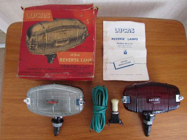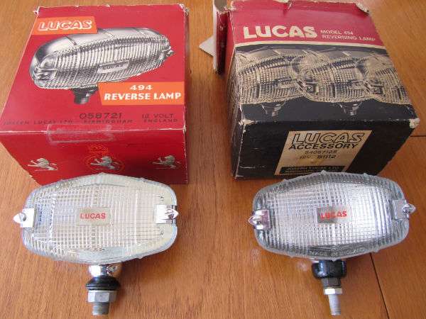 Here we have a variety of rear lamps, all Lucas 494 type but with different part numbers. The first three have the early issue cross hatch lens pattern. The fourth with red lens has the later vertical rib pattern. The red lens was required as a rear fog lamp in some European countries. In that case the car might have a red lens fog lamp on one side and a clear lens reversing lamp on the other side.