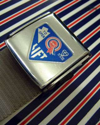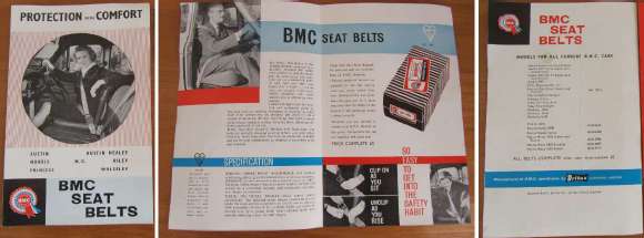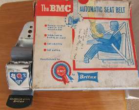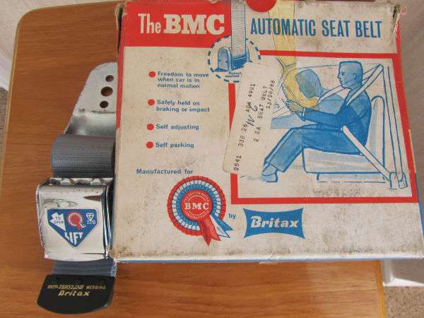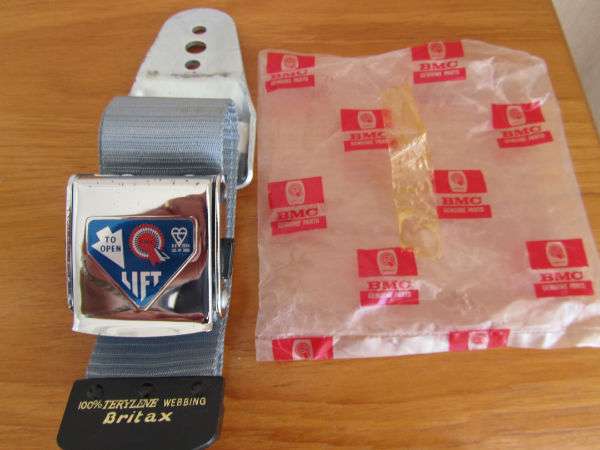 Period style seat belts for the MGA would be "aircraft style" belts with a lift buckle and chrome plated hardware. It is likely that all seat belts would have been either dealer installed or aftermarket parts (unless the car was special ordered with seat belts from the factory). The belt color was most commonly black, regardless of interior colors. Other color belts were and are still available, but colors other than black are a matter of personal taste (may look odd in the MGA). The correct BMC sticker for the buckle is shown at tight in a photo from an eBay ad.