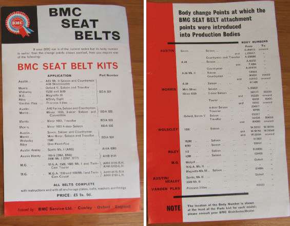 I have found my BMC seat belt leaflets. The single page insert shows the Body Change Points at which the attachment points were introduced into production bodies. This shows the MGA MK.2 had these points from the outset. The front of the leaflet shows the part numbers of the BMC Seat Belt Kits if your car was of the current series but its body number is earlier than the change points shown overleaf. This shows that the MGA 1500, 1600 MK.1 and Twin cam Tourer required Part Nos. AHH 6141-R.H. and AHH 6193-L.H. Also the MGA 1500 and 1600 MK1 and Twin Cam Coupe required Part Nos. AHH 6175-R.H. and AHH6194-L.H. The Price was £5 5s. 0d. -- Derek