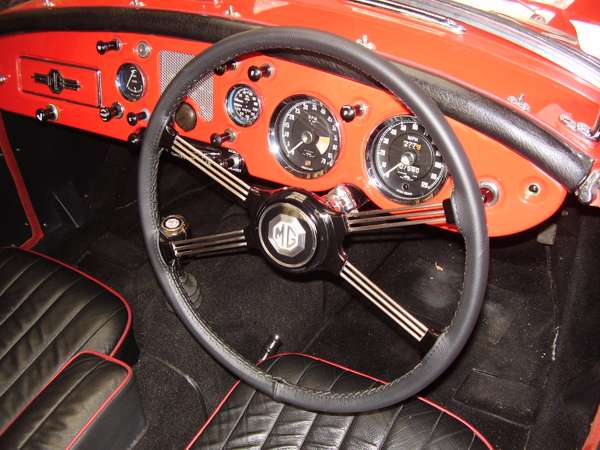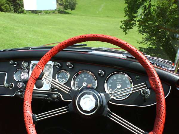 The original MGA steering wheel is rather thin by design, in keeping with the lightness image of the sports car. Unfortunately that makes it a bit slippery to grip, especially if you happen to be used to a thicker wheel rim. Leather driving gloves might help some, if you like that sort of thing. The aftermarket steering wheel wrap does wonders to make the wheel rim thicker, give it a better grip, and keep from burning or freezing your hands during radical weather conditions.