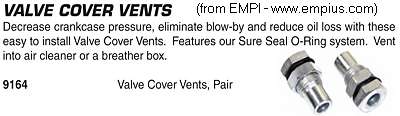 If you have a valve cover with no vent pipe, and you want to install the 1/2-inch vent hose from valve cover to air cleaner, then you need to drill a hole in the valve cover to accept a vent adapter fitting. The one pictured here was originally intended for valve covers on Volks Wagon air cooled engines. It is made by Empi (part number 9164), has a JK Part Number J18151 (www.justkampers.com), and is commonly sold with two pieces in a bubble pack. The same part can also be used to add a vent port to an air cleaner housing.