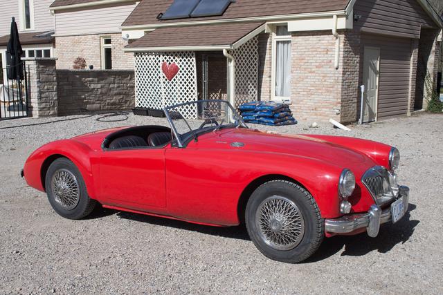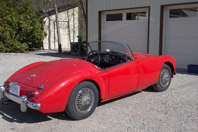 These wire-wheel wheel covers were a fairly popular accessory for cars that never had wire wheels, but would be rather rare on an MGA. This car was re-imported from New York, USA to Denmark in 2007, and the side marker lights were installed in 2011 to suit the Danish regulations. The wheel covers appear to be from Ford Thunderbird of late 50's or early 60's. For a North American car this would be a period accessory, although not specifically for an MGA. They are more generic wheel covers to fit any 15-inch steel wheel. Any aftermarket auto parts vendor selling wheel covers should be able to source wire-wheel wheel covers for 15-inch wheels.