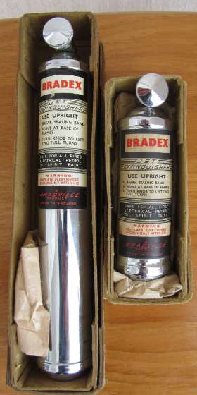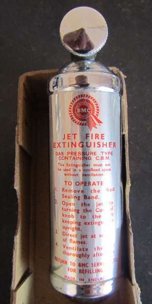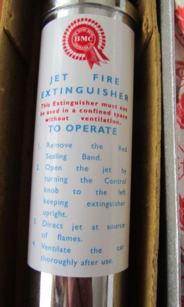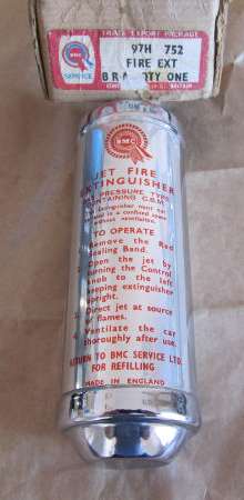 Photo at right shows the two sizes of these extinguishers but with the manufacturers labels attached, ie. Bradex. This is a case of BMC using other manufacturers equipment but with BMC branding. Bradex also made these with Aston Martin labels.