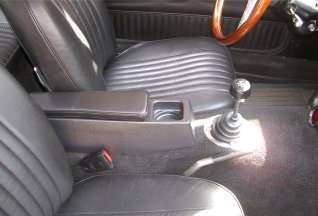 This center console, armrest, storage box will be a matter of personal taste. In the MGA it requires that you throw out the original leather-top, vinyl-sided padded armrest. The body of this unit is grained molded ABS thermoplastic, black only at this time. The top cover is black leather covered. Personally it rubs me the wrong way to have plastic parts anywhere on the MGA, but a little extra storage space may be useful. For sure the cup holder is not very secure, and a cup would be square in the way of the shifter.