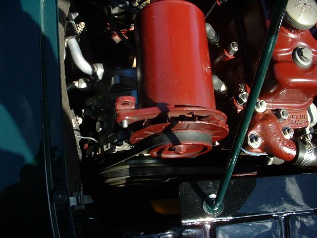 Starting at the working end, the A/C compressor is a Sandon model 507 mounted with the brackets originally intended for use in the early MGB GT with steel dash, vintage 1965-1967. See photo on right; click for larger picture. The compressor may have multiple sources, used in different cars, but the brackets for mounting it on the MG engine may be rather rare parts, so good hunting. Notice that the generator is mounted above the compressor. The compressor is driven with a double groove pulley which is part of the compressor electric clutch. When the compressor is turned off the pulley freewheels with a ball bearing. The compressor pulley is driven by the fan belt, and the second groove in the pulley is used to drive another shorter belt to run the generator. Note also that the thermostat housing and radiator have the top hose on the opposite side from the normal MGA (also MGB parts). The second picture is a different car mounting an alternator on the 1968 and later MGB thermostat housing (normal mount for an emissions sir pump).