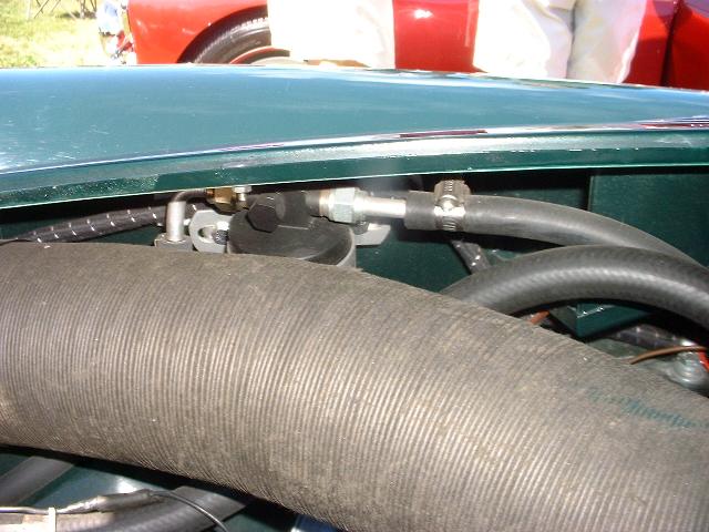 Finally a picture of the working connections showing the hoses dropping through the heater shelf and running to the back of the cooling box. Looks like a minor obstruction of the snap down carpet flap on the tunnel, but I'm sure the hoses can be nudged aside to check the gear oil.