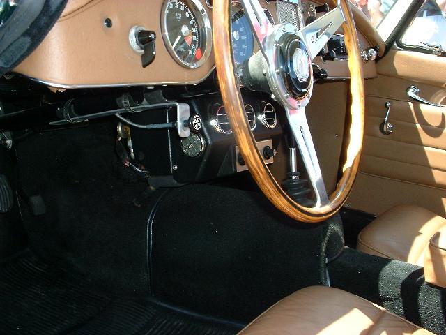 The pull control knob and cable to the left of the cooling box (long "L" bracket attached to the steering column with a pair of worm drive hose clamps) is Mike's "quick and temporary attempt at cruise control". He says it works great to to give his foot a break occasionally. While this may work only on level roads or constant grades, it may be more reliable than the electronic and vacuum control units. I've had 3 or 4 of those on my MGA from time to time, all ending up in the trash bin for various reasons of failure.