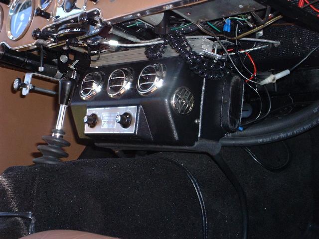 The evaporator and fan unit is seen here from the left side under the dash. Again this is a "standard" part from the steel dash MGB GT 1965-1967. I am assured that this part doesn't weigh much, having a small radiator and a blower fan in a molded plastic box with some adjustable vents. Here it is hung from the two center dash brace rails which attach to the bottom edge of the dash with the heater control panel mounting screws, and to the bottom corner of the heater shelf at the front end. Mike tells me this unit can be pushed fore or aft along the dash brace rails, so put it wherever you like.