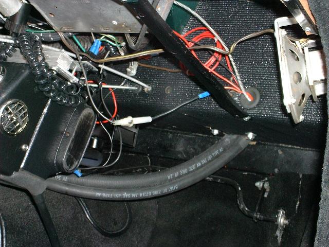 Also see the new wiring running through the firewall grommet along with the original temperature gauge sensor line. These wires would be the power supply wire with an in-line fuse, and a pair of wires to control the compressor clutch. On the far right a radio speaker.