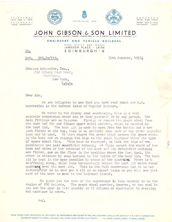 A letter by 'John Gibson & Sons Ltd.' explaining the dicky-seat conversion (click for larger images).