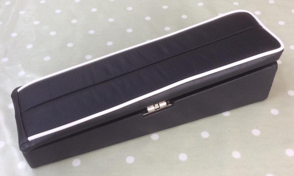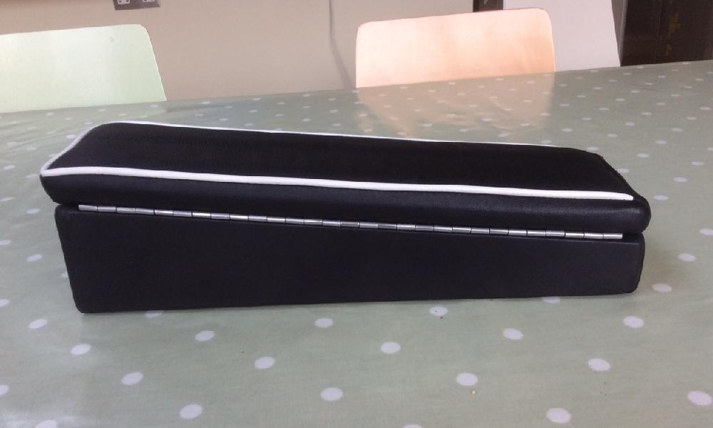"First, I downloaded the dimensions from the internet, blew them up and made a template and constructed a box and lid from mdf. Then I bought a piano hinge and ball catch online. Finally, I purchased a standard foam filled armrest and, in this case, some black leather (but vinyl will do).