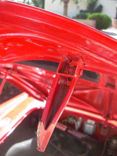 I have a few reports of the MGA bonnet safety catch misbehaving. In some cases the bottom end of the catch arm may go too far forward and fall in front of the catch bar. Then you have to manually push the arm back behind the catch bar before the bonnet will close. In one case the arm moved so far forward as to get hooked underneath the bonnet latch platform, thereby preventing the bonnet from opening.