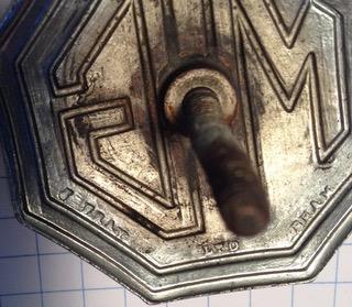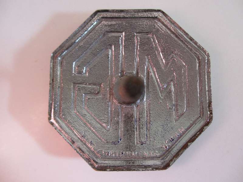 This grille badge is almost perfect for MGA. The MGA badge has the threaded center stud for mounting, but not the offset pin. I post these pictures because it is an excellent example of an original MGA badge, except for the offset pin. If you would cut off the extra pin it would work perfectly for the MGA.