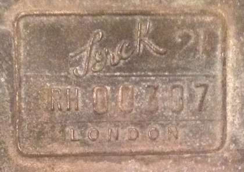 This grille surround was purchased on eBay in November 2013 by Edward Vandyk in the UK. It is rather beat up, possibly restoreable. The part is non-magnetic brass. The interesting bit is this tag soldered to the inside of the chrome grill surround. Since the tag is cast with raised lettering, the number RH00307 will be a part number, not a serial number. To the right of the manufacturer's name is "21" which is stamped and may be a serial number.