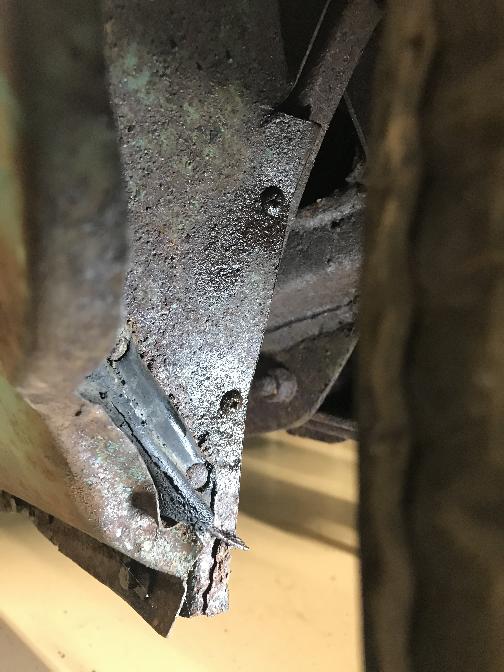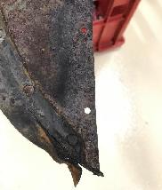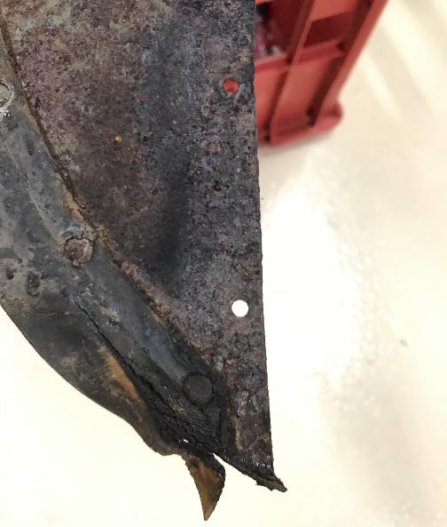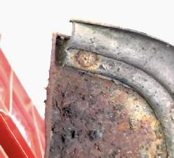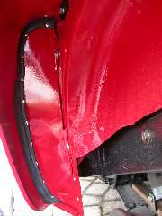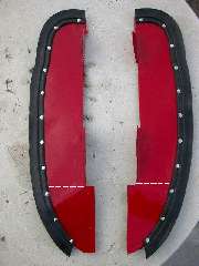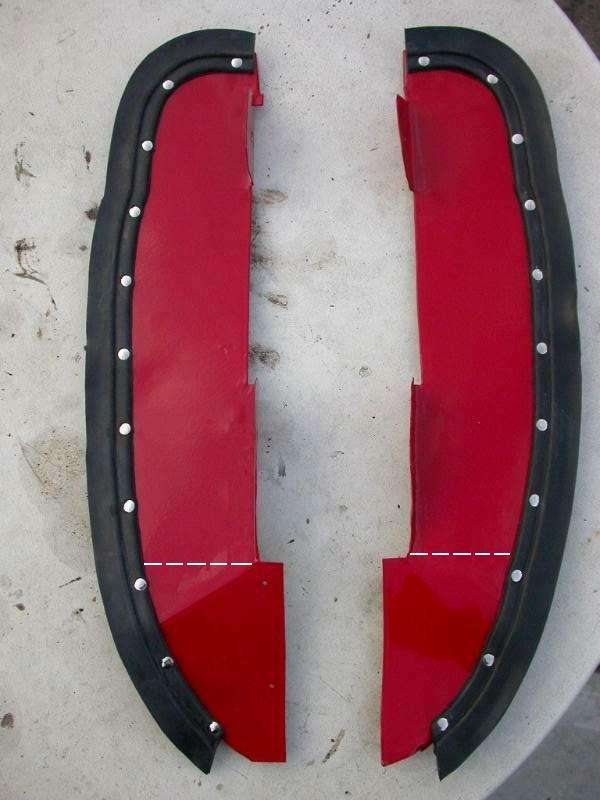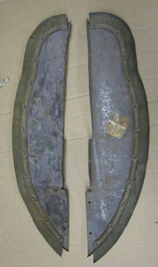 Photos below (courtesy of Wim Betzel in the Netherlands) shows a restored set. The dotted lines highlight location of a bend line. Below this line the panel is bent forward and curved to match contour of the inner fender flange (with two screws).