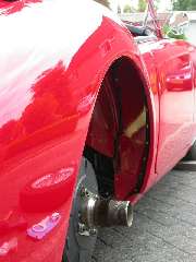 For nearly the first two years of production there was no splash panel ahead of the rear wheel, but it is highly recommended to retrofit the later parts. Beginning with car 29935 in April 1957 splash panels were installed in front of the rear wheels, attached to the main body and sealed around the outer edge. Installation of these panels to earlier cars requires drilling two holes in the inner fender. The top bolt hides behind the rear kick panel. The bottom bolt is underneath just aft of the body mount bracket.