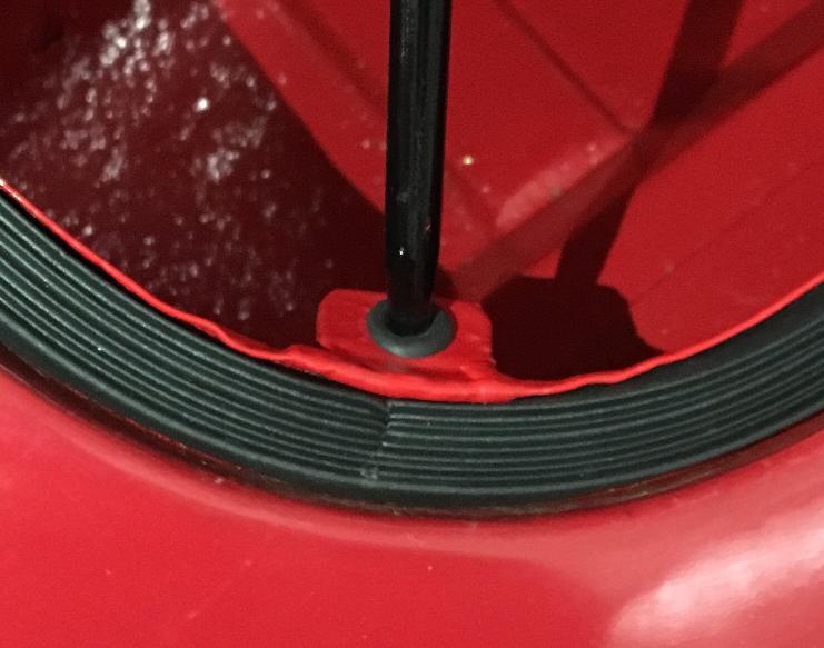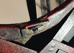 "A picture of the boot stay. The rubber plug is just the right size to protect both prop and hole. This seems like a nice solution, and the plug is sold by Todd Clarke as a headlamp adjuster cover.