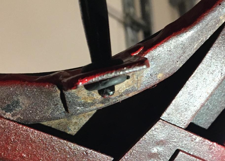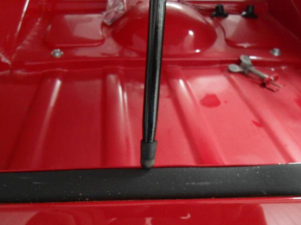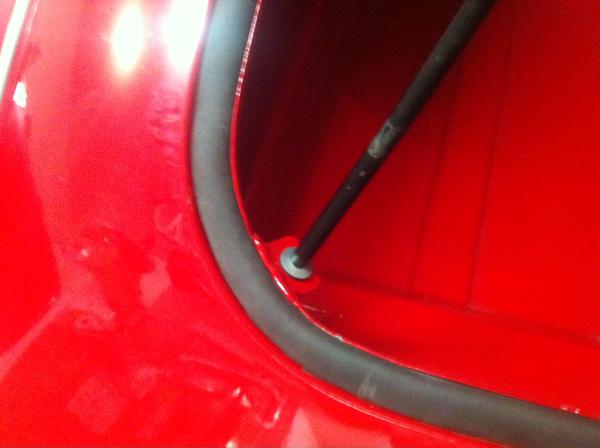 "About putting a washer on the end of the rod to keep it from going through the hole and scuffing up the boot floor, I tried it. Worked great, except the washer chipped the brand new paint on the tab. I happened to be at the hardware store when I came across what the store listed as a "bonded washer". Basically, a metal washer with a sheet of rubber pre-attached. I touched up the paint and stuck it on, no more chips! Hopefully you can make out that it's a two-ply washer with the rubber side toward the nesting tab. Just a press fit on the end, sorry I didn't note the size.