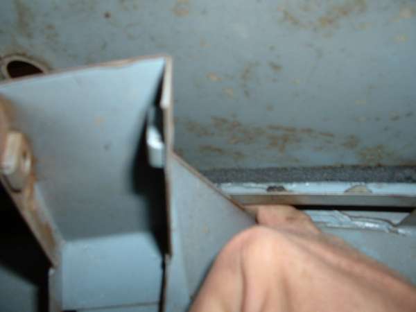 If this is not successful and/or you feel the need to cut and weld, keep in mind the configuration of the parts here. Access to the underside is quite restricted inside the pocket. This could be easier if the body was inverted for work. If you want to cut through from the top, you will be passing through the outer body cowl, a felt packing strip (if the original piece is still there), and the body brace channel. When welding, keep the felt strip in mind as a fire hazard.