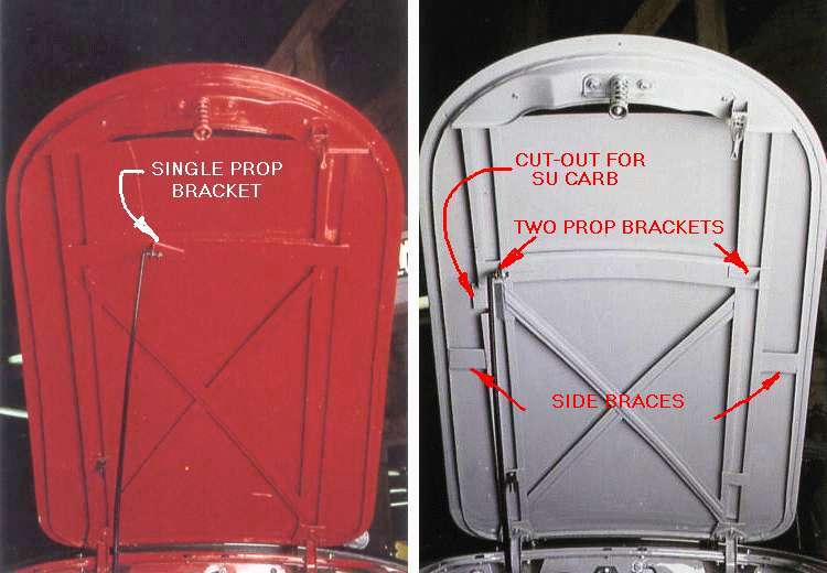 Early bonnet bracing below left. -- Later bonnet bracing below right.