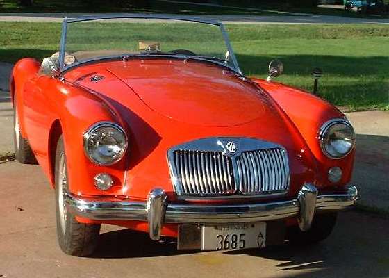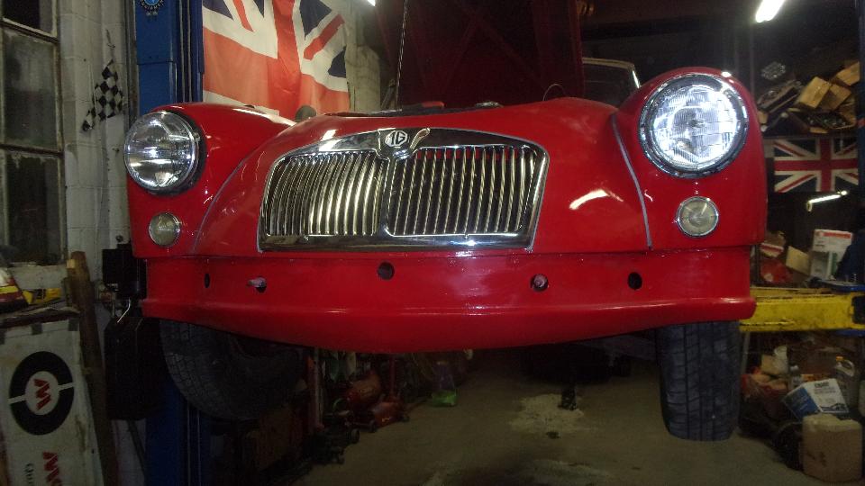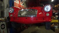 in picture at right that you may see the small hex head screws visible immediately above the bumper. It is nearly impossible to fit the bumper close enough to the body to hide these screws. The chrome grill and front bumper with high contrast to the body color are very important appearance items on the MGA. You might spend a lot of time massaging the body nose to fit properly around the grille before painting, then spend more time getting the bumper aligned well enough to look good.