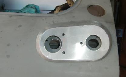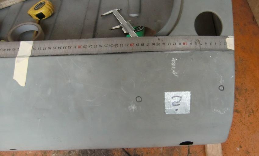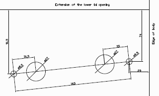 Below left is a drawing of correct hole locations for right side, dimensions in mm (click for full scale PDF image). Below right is a photo showing reference lines for the layout.