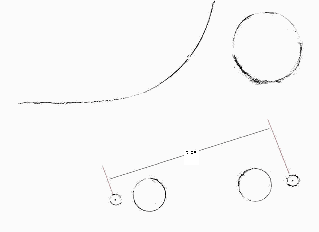 The illustration began life as a charcoal tracing taken from a 1600-MK-II car (click for larger image). So far not sure about the exact orientation, as the tracing may be rotated slightly out of position. Also the currently available image is not full scale, but we have one dimension available to rescale it to full size. We hope to have a better drawing and better hole locations later. Once the image is full size it maybe aligned with the boot lid aperture and the fuel filler hole to get correct orientation and hole positions for the right side. Left side holes will then be mirror image of the right side.