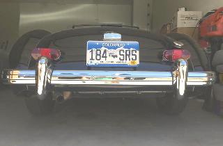 Photo above shows location of the left lamp. Bottom of the lamp fixture and plinth should be level, straight across, while top is canted downward toward the inboard end. The corner of the plinth is about an inch from the boot lid, while the outboard end is about 1/2-inch from the body edge. There are four holes in the rear valance for each tail light, one hole for each light and two holes for the bolts that hold them on. The inboard bolt hole is 7-1/2 inches from the outer edge. If you have a plinth gasket (that actually fits the plinth to body joint), you may be able to use the gasket for alignment and template to mark location of the holes.
