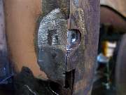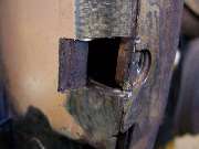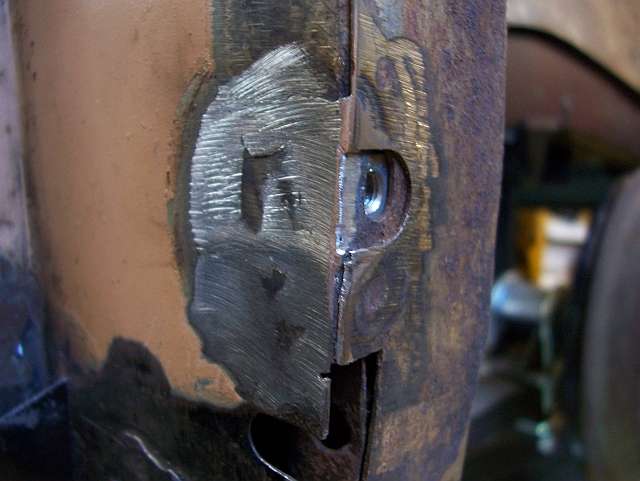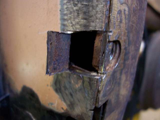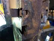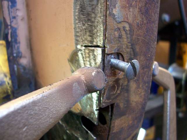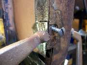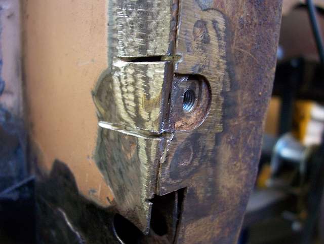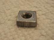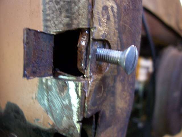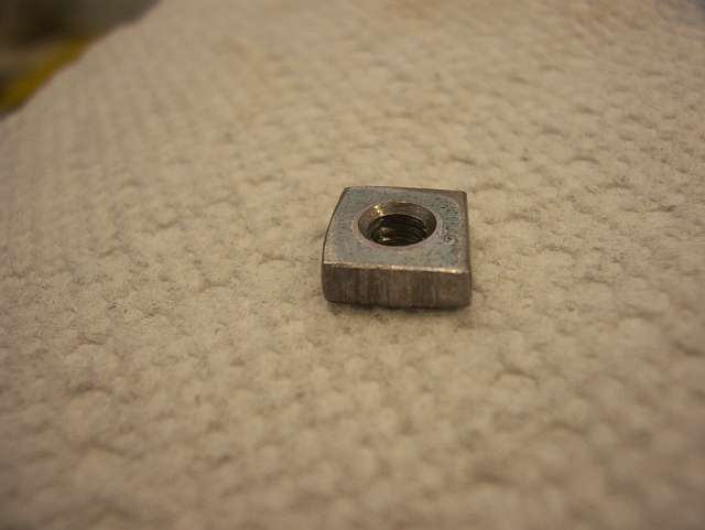 The nut holder is a simple folded cup, spot welded to the inside of the front face of the post. So I chose to slice into the post on the side with my Dremel and bend out the tab created and then bend out the flap on the side of the nut holder cup. Turned out to be super simple and the nut then just popped out with a little push. I thought that finding a square 10/32 nut locally, might not be so easy so I just made a new one. With the new nut in place and the cup flap back in position and the flap of the post folded back, a quick weld bead and side grinder flap disc treatment, all is wall again. I have attached pictures of the operation".