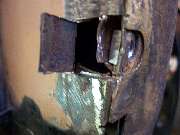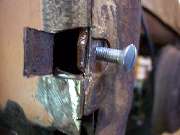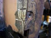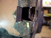 "I replaced one of the captive nuts for the screws that hold the door shut face panel on the B post. The threads were stripped on the nut and I preferred not to use one odd screw for the panel, so replacement was the option I chose. I didn't know how the nut was held in position, so that was the first task before cutting into the B post. I tried looking thru the various holes in the pillar and a little mirror on a stick, but I ended up using my tiny 12 volt light bulb on a wire to light up the inside of the pillar and looking thru the hole at the door striker tapping plate opening.