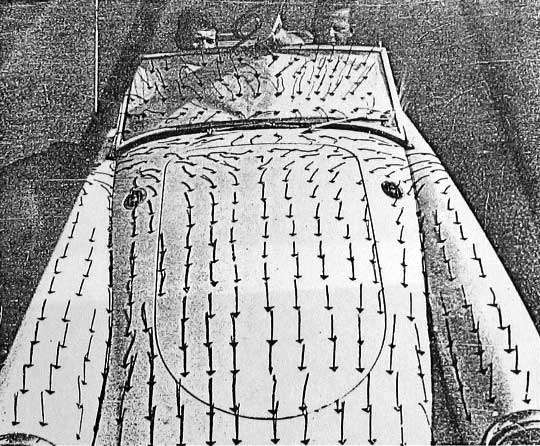 Note that these louvers likely work okay with a cut down competition windscreen. The standard windscreen builds up a pressure cushion in front at road speed, far enough forward to make air flow into the cowl vents rather then out. It is a good idea to keep the louvers forward of the windscreen about 1-1/2 times the height of the windscreen. Design at right may be practically useless with a standard windscreen at road speed, but might help reduce coolant temperature at very low road speed or when standing still. Also for a street cruising car, it may be a bit uncomfortable to have hot air from the engine bay flowing over top of the windscreen during hot weather conditions.