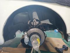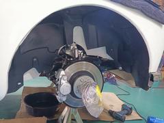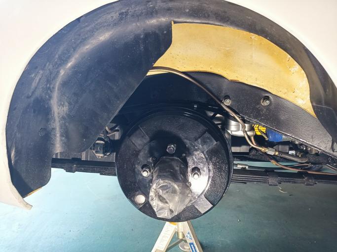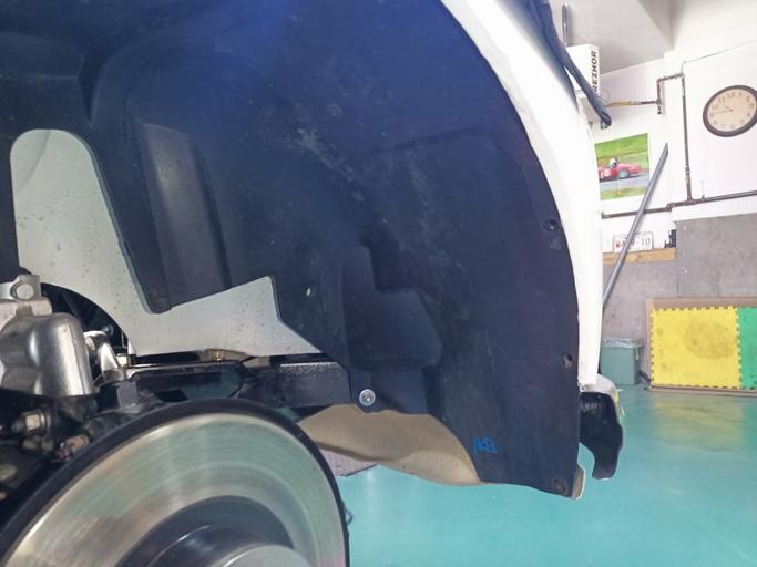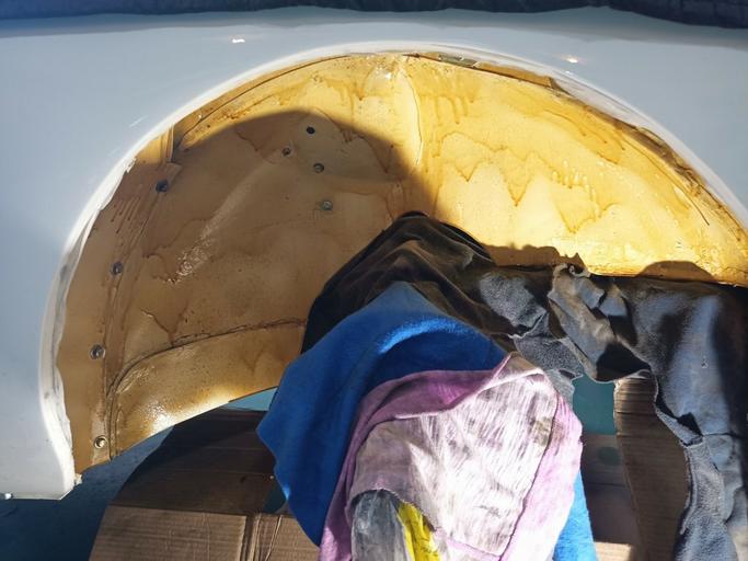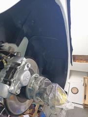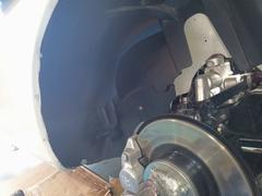 After I drilled the liner and trimmed the excess, I removed it and sprayed the wheel wells with cavity wax for protection. It's a very good product and easily removed with Alcohol if necessary. I left it to dry for a day until final assembly. I tested the liner for wheel turning range to make sure it doesn't foul with the steering, etc. Also, it doesn't cover any service parts.