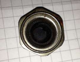 This is a picture of the (non-original) non-return valve in the TRW/Lucas master cylinder. Notice the small hole drilled in the side of the steel valve body to serve as the slow-return pressure relief. The high residual pressure problem is apparently caused by the piston return spring being too strong. See more on the next page about the TRW/Lucas master cylinder.