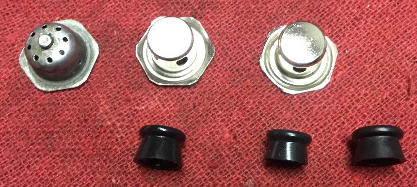 Left to right, a 1/32" drilled TRW valve, a new AP valve, and the original one from the Lockheed master cylinder. Notice the tiny hole (smaller than 1/32") at base of the original valve foot.