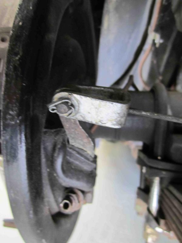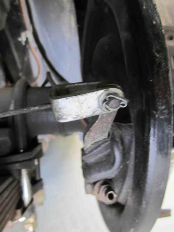 "I am completely mystified by my braking problems; I have at least 3/16 on all shoes. I cannot get any purchase on the parking brake. All parts are free and greased. Should the cable outer that goes thru a bracket on the back axle, be RIGIDLY trapped in the bracket, or loosely contained ; the bracket seems to have both options in its design, i.e. a wider part for loose (floating) and a longer narrower part (for tight and trapped), and I can see that the cable outer part is supposed to move to operate the right side of the mechanism at the end of the system, at the so called equalizer bracket".