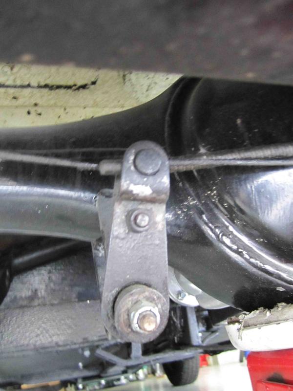 Where the hand brake cable passes under the rear axle housing there is a special bracket and an elongated P-clip holding the cable. This bracket is attached to the same mounting point as the brake line 3-way fitting.