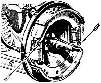 It is preferable to visually inspect front drum brake systems where two cylinders are used. Back off the adjusters to permit the removal of the drum. Get a helper to push the pedal gently. Observe the action of the cylinders' pistons - only one cylinder may be working, while the other may be stuck. That will stop the wheel, but not very well. If the cylinder does not retract fully when pressure is released you can see right away that it will have to be rebuilt.