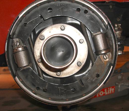 Notice where there are two holes close together in the shoes for the tension springs. Springs for the rear shoes go into the closer holes, while springs for the front shoes go into the longer distance holes. Front slave cylinders are shorter than rear slave cylinders, while the rear abutment is shorter yet. This makes the front shoe assembly symmetrical and the rear shoe assembly asymmetrical. The top or forward spring on the rear shoes is also thinner and shorter, while the springs pulling to return the cylinders to rest are thicker (for stronger pull).
