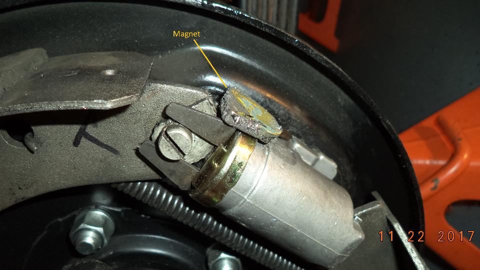 "I needed to replace a leaking rear brake cylinder. I've always had a problem with keeping all the parts aligned while I install the brake shoes, particularly the snail cam sub-assembly which slides easily out of position. It occurred to me that a strong magnet as shown in the attached picture would eliminate that variable. Tried it and it worked very well. Got everything in place and secured in record time. Don't forget to remove the magnet before you button it up".
