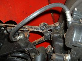 The photo at right comes from Dominic Clancy in Switzerland. This shows a 1500 frame with 1600 brake caliper. The standard 1600 hose is routed downward from the 1500 bracket, while the 1600 type metal supply pipe has been re-routed to the top and extended to be slightly longer than original issue. Adapting the small hose end to the larger hole in the bracket looks like a large flat washer.