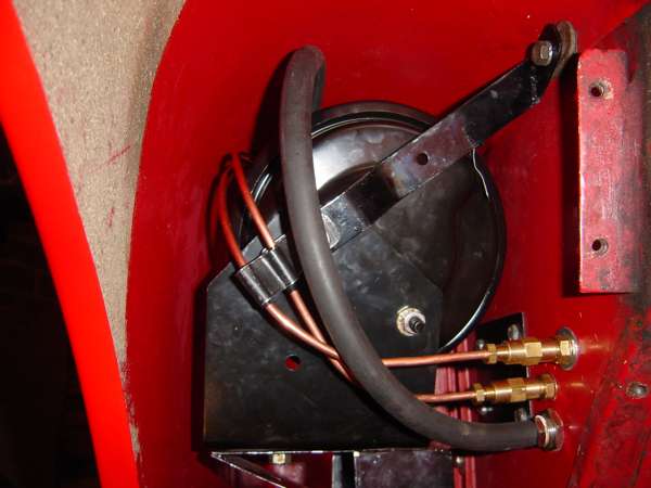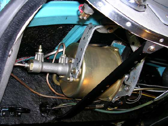 Above left is another remote booster mounted in similar fashion with different brackets. Photo from J H Cole, Hampshire, UK. Above right is a power brake booster mounted behind the dash on the passenger side of a RHD car. Photo from Bruce Mayo, West Sussex, UK.