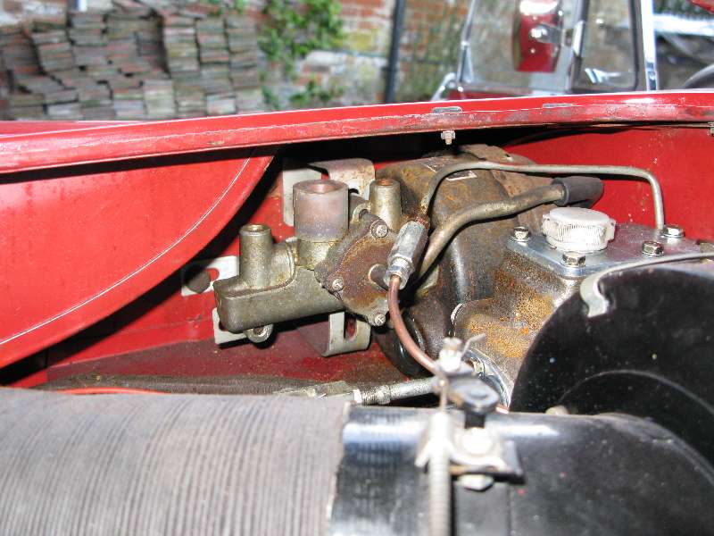 This booster is installed in the right rear corner of the engine bay in a RHD MGA. Apparently it was bypassed with a tubing connector after the booster failed. Most booster failures are a result of a split rubber diaphragm in the vacuum chamber. I saw one fail once during a car club tour. The driver had to stop and refill the master cylinder reservoir and bleed the brakes every 20 minutes or so, as brake fluid was being sucked through the servo vacuum chamber into the intake manifold to be burned in the engine. On the third or fourth stop the convoy was collectively running low on spare brake fluid. So we pinched off the vacuum hose with a small ViceGrip to disable the servo, then continued on with manual brakes for the rest of the day.