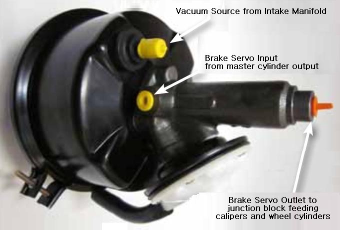 Then be sure the pipe running from master cylinder to servo goes into the side of the servo, and the pipe from end of servo goes to the fluid splitter block. The servo will not work properly if these pipes are switched.