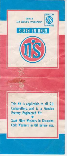 If it leaks after reassembly with old seals, you would need to install new seals. New jet seals should be soaked in oil before assembly. The jet has to be free enough to slide upward to rest with only the force of the tension spring on the end of the choke arm. Slide the jet up/down a number of times to free it up if necessary. Instructions on the SU seal kit shown at right say to soak fiber washers in kerosene, and soak cork washers in oil.